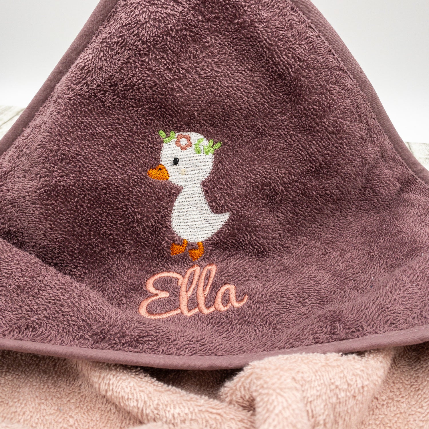 Kapuzenhandtuch mit Gans mit Namen personalisiert