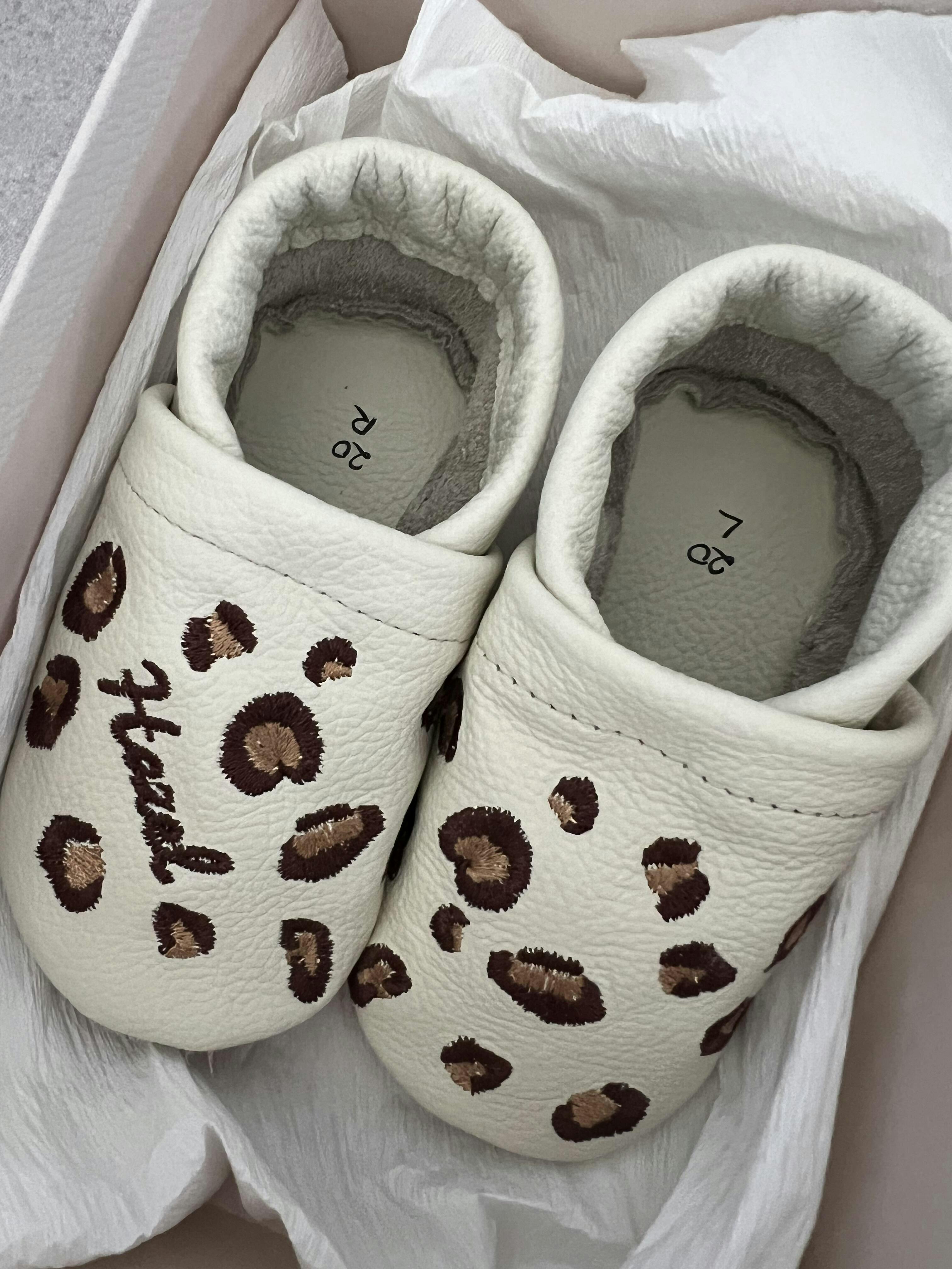 🐆 Krabbelschuhe & Hausschuhe mit Leomuster – beige mit optionaler Namensstickerei
